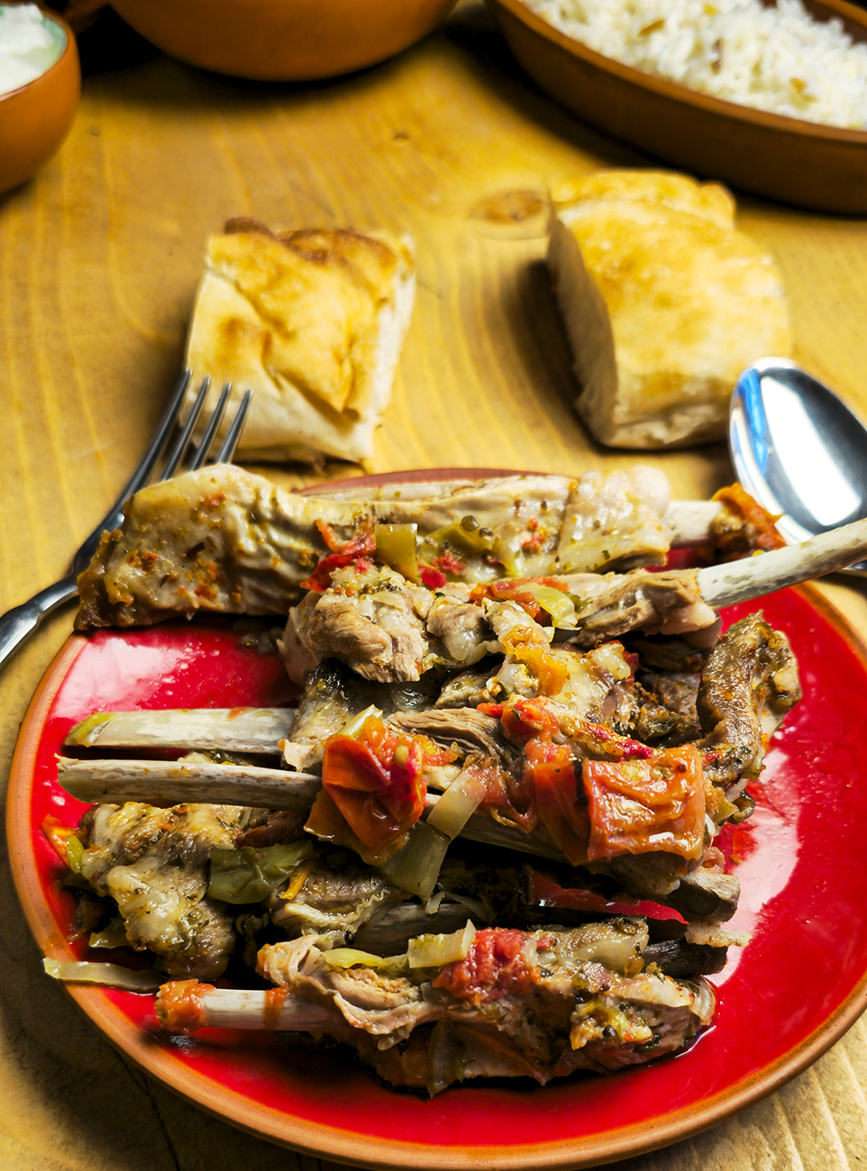 meat, garlic, green pepper, tomato, thyme, chili pepper, salt.